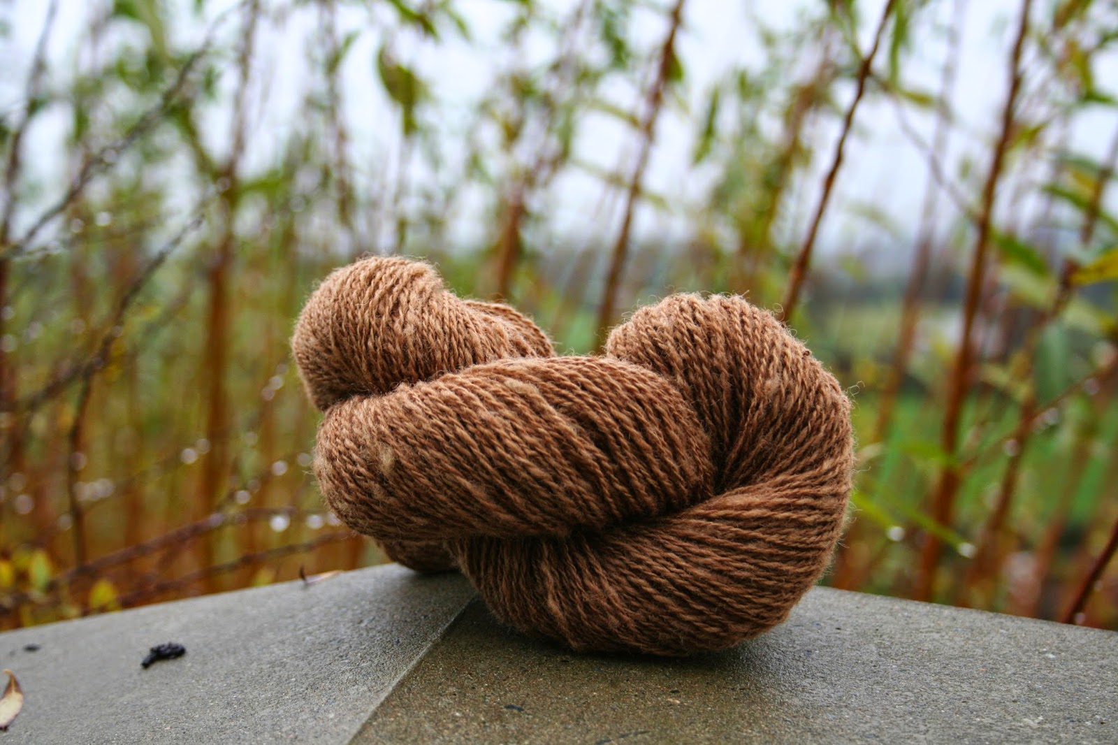 Dying with beech leaves. I stuffed the dye pot to the top, and left soaking overnight. I used 1:1 ratio (wool to dry weight of leaves). Next morning, gentle simmer for an hour, and strained off the dye. A surprising depth of colour in the water for a bag of end-of-the-season leaves. In went the pre-mordanted (Alum/Cream of Tartar) wool.
